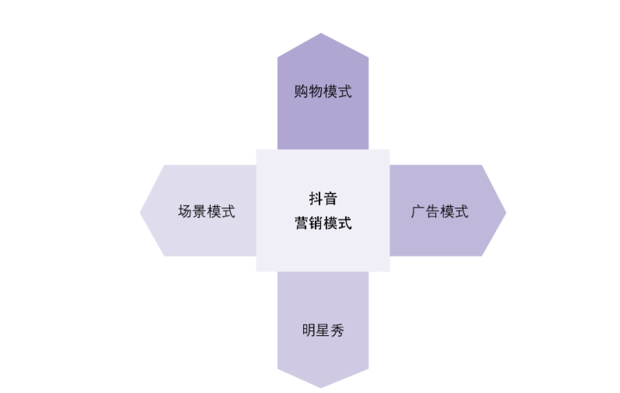 抖音营销作为一种新营销方式,与传统营销存在着很大区别,不同的营销方式有不同的模式。抖音营销有着不一样的营销模式,常见的有4种模式,分别为购物模式、广告模式、明星秀和场景模式,如图所示。