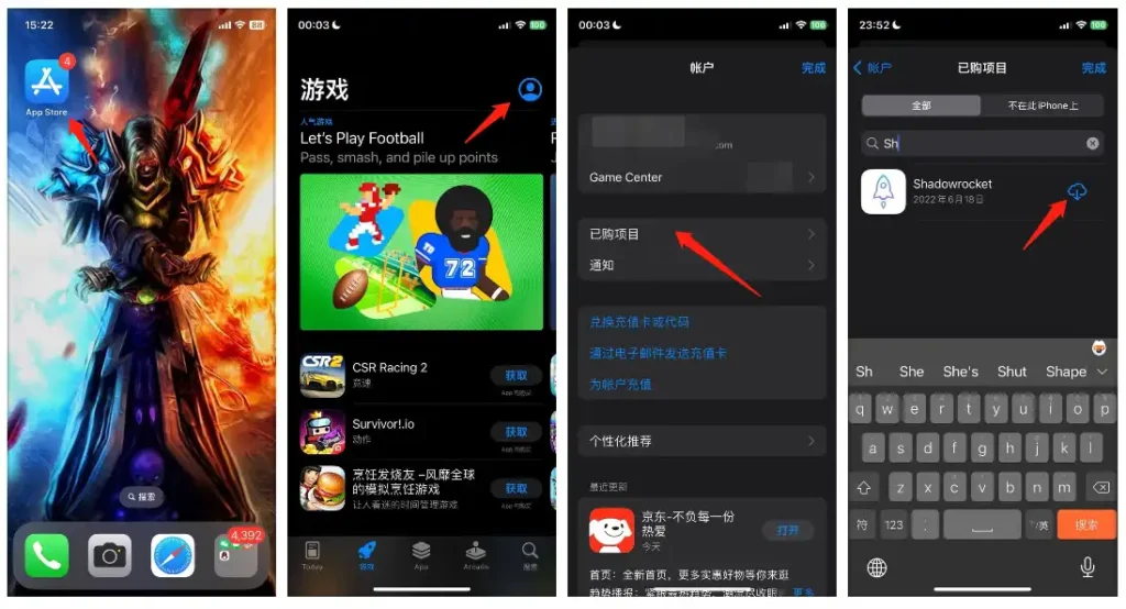 登陆成功后,点击 App Store > 右上角头像 > 已购项目,在搜索框中输入 ShadowRocket,下载即可。