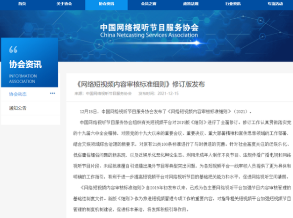 12月15日,中国网络视听节目服务协会发布了《网络短视频内容审核标准细则》(2021)。