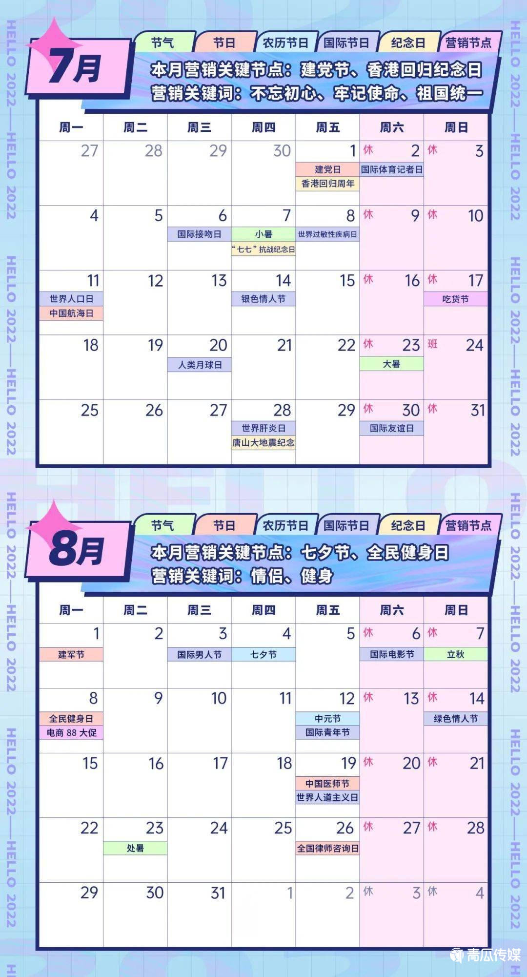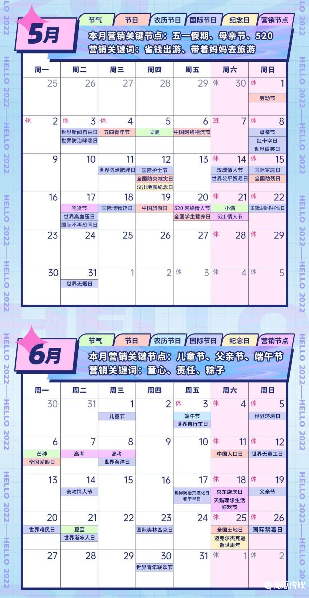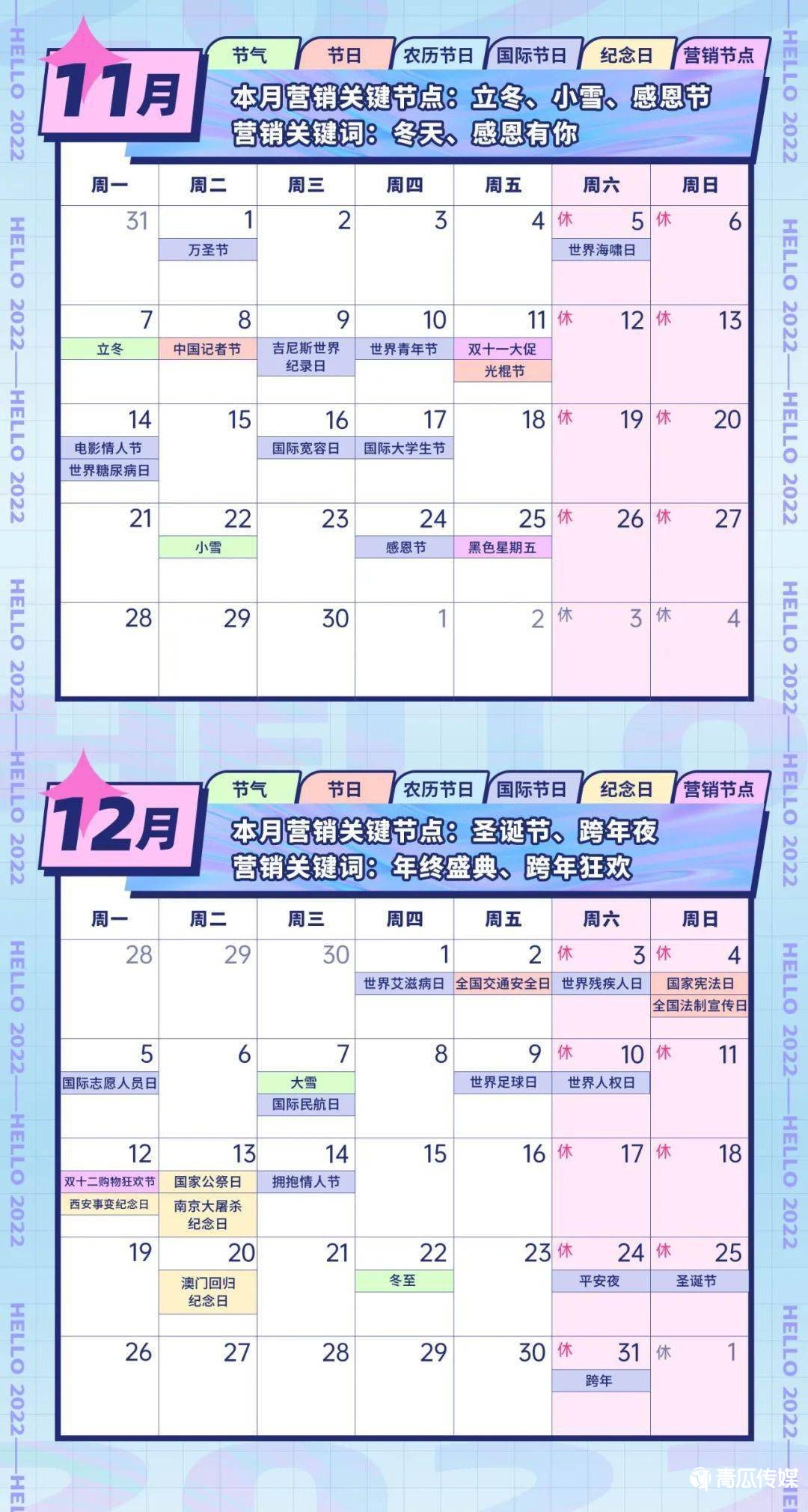本文为各位小伙伴整理了“2022年全年营销热点日历”,包括了节日节气、纪念日、大事件,互联网热点等100+个营销节点,助力大家抓住机会,打破淡季魔咒,实现流量暴涨!