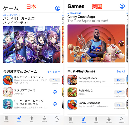 除了都隶属于苹果手机和应用商店里的内容部分相同,几乎都是不一样的,区别可以说非常大了。语言是不同的,日本的显示日语,美区的显示英文,里面可供使用的软件也大相径庭,就算中文名同样的游戏,它们属于的也是不同的服务区,所以还是不一样的。